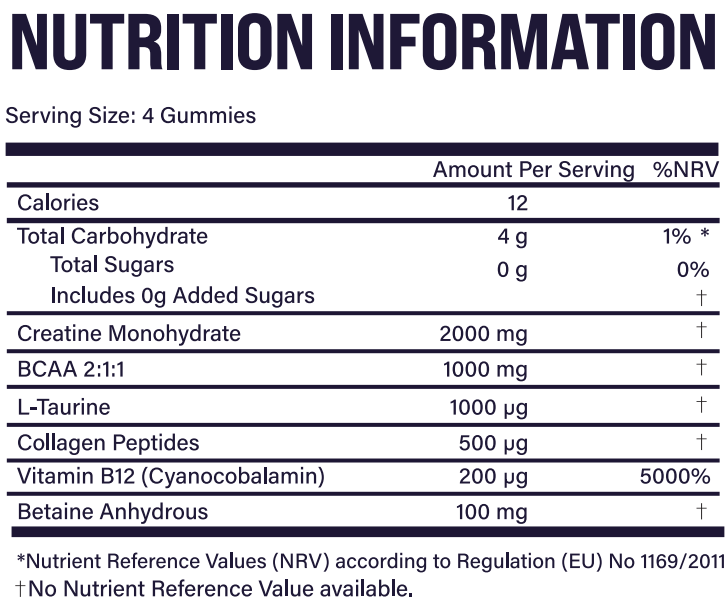 Calories, Total Carbohydrate, Creatine Monohvdrate, BCAA 2:1:1. L-Taurine, Collagen PeptidesVitamin B12 (Cyanocobalamin), Betaine Anhydrous.